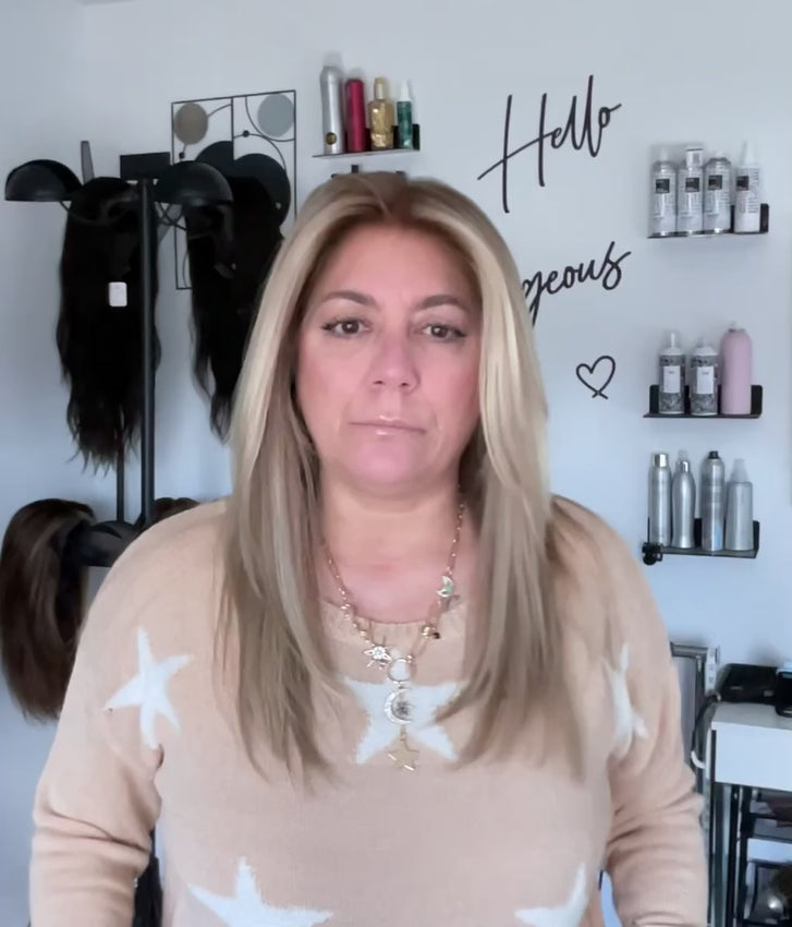 Dimensional Medium sandy gold blonde and lighter blonde with a darker blonde root